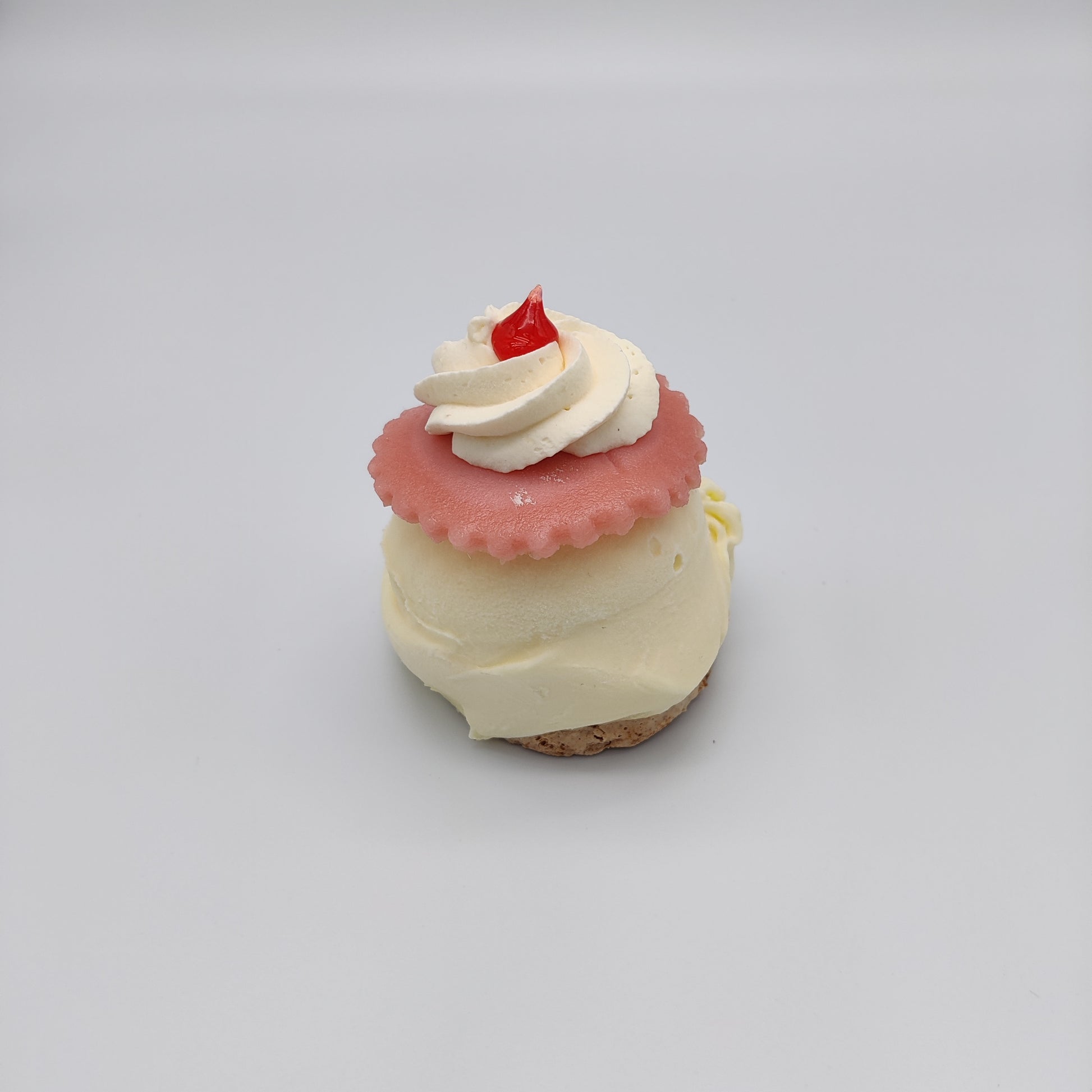 Vanille-ijs op een biscuit-vanille koekje afgewerkt met een marsepeinkroontje